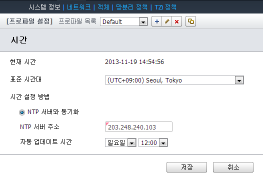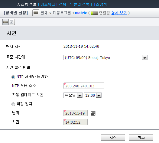 - 시간 설정 방법은 NTP 서버와 동기화나 직접 입력