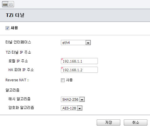 TZi 터널 IP 주소는 통신할 TZi 네트워크와 동일한 IP 주소 대역에 속하는 IP를 사용해야 합니다. HA가 구성되어 있는 경우, TZi 네트워크 내부에서 HA 피어마다 터널 IP 주소를 하나씩 할당합니다.