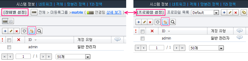 장비별 설정 네비게이션 및 장비별 설정과 프로파일 설정간 전환