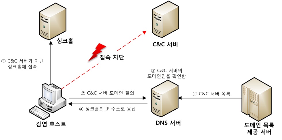 감염된 호스트에서 공격자의 명령을 받기 위해 C&C 서버에 접속하게 됩니다. C&C 서버로 접속하기 위해 DNS 서버로 도메인 질의을 요청하면 C&C 서버의 IP 주소 대신 싱크홀 서버의 IP 주소로 응답하여 C&C 접속을 차단하는 기능입니다.