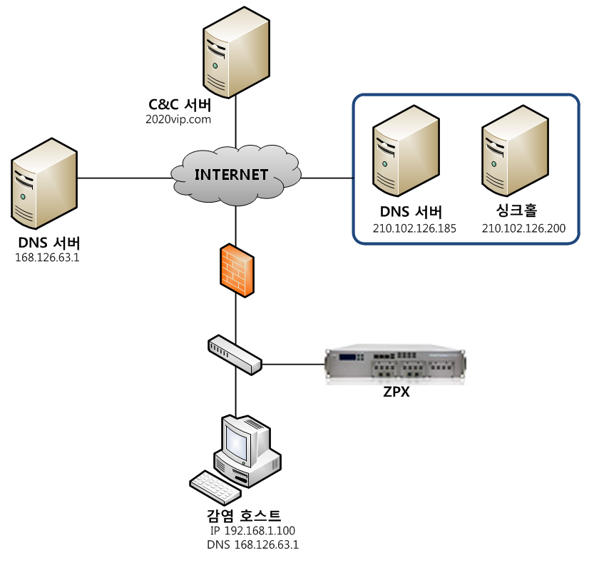 <네트워크 구성 예제> ZPX의 DNS 싱크홀 기능은 다음과 같이 동작합니다.